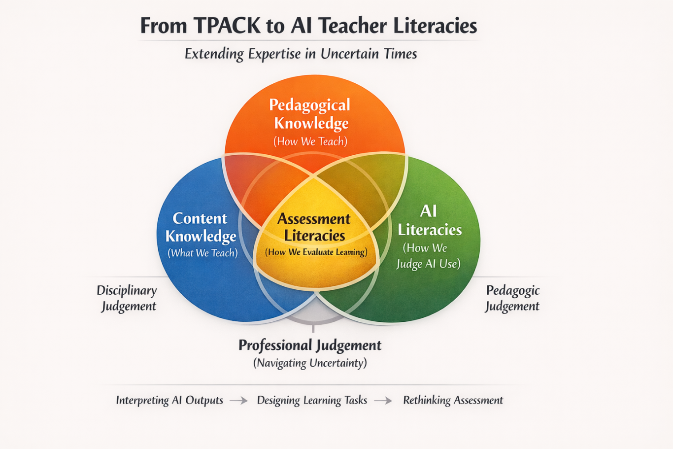 Rather than treating AI literacy as an additional competence to be bolted on, it is more productive to use TPACK as a lens for examining how AI reshapes the intersections between content, pedagogy, and assessment.